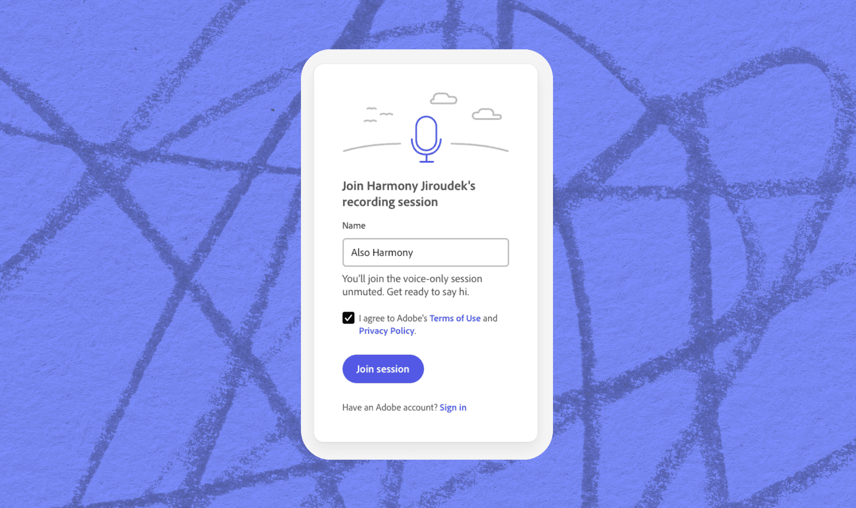 Regardless of whether the host will be using Adobe Podcast or another platform, try to familiarize yourself with the recording app to at least understand how to use basic controls. And if your host is using Adobe Podcast, all you’ll need to do is click or tap a link, enter your name, then hit “Join session” to connect with the host.