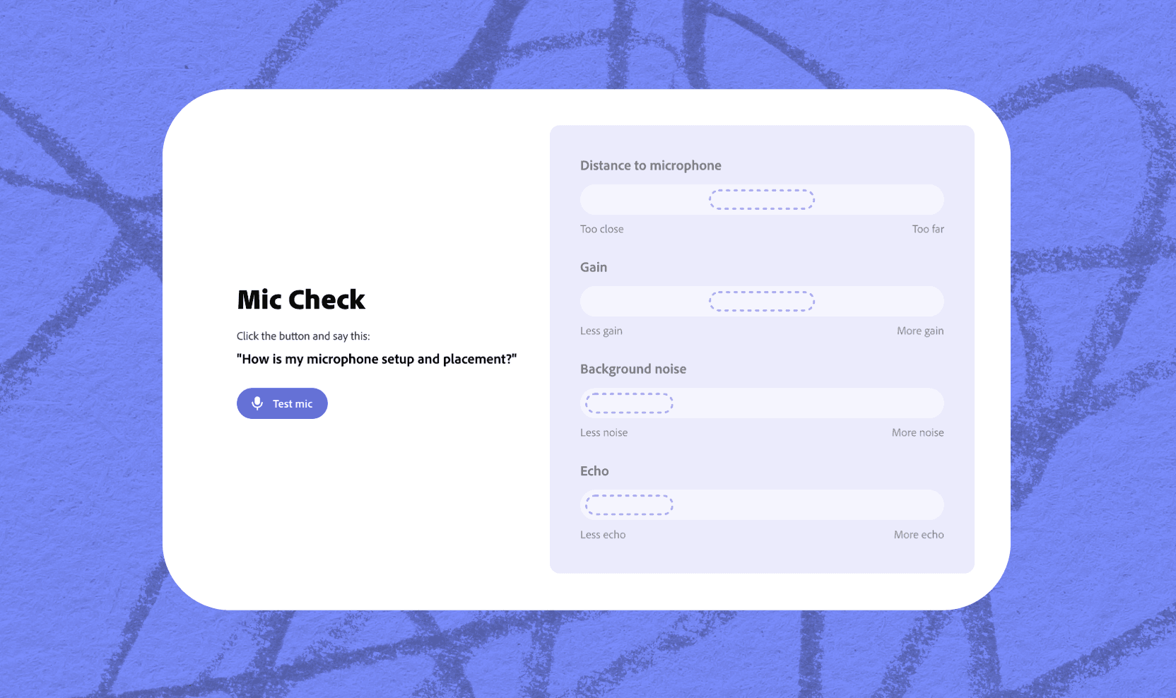 That’s why the first step for recording your podcast is making sure your recording equipment is actually working. Adobe Podcast’s Mic Check feature is exactly what it sounds like: a way to check your microphone connection and fix any problems before they even come up.