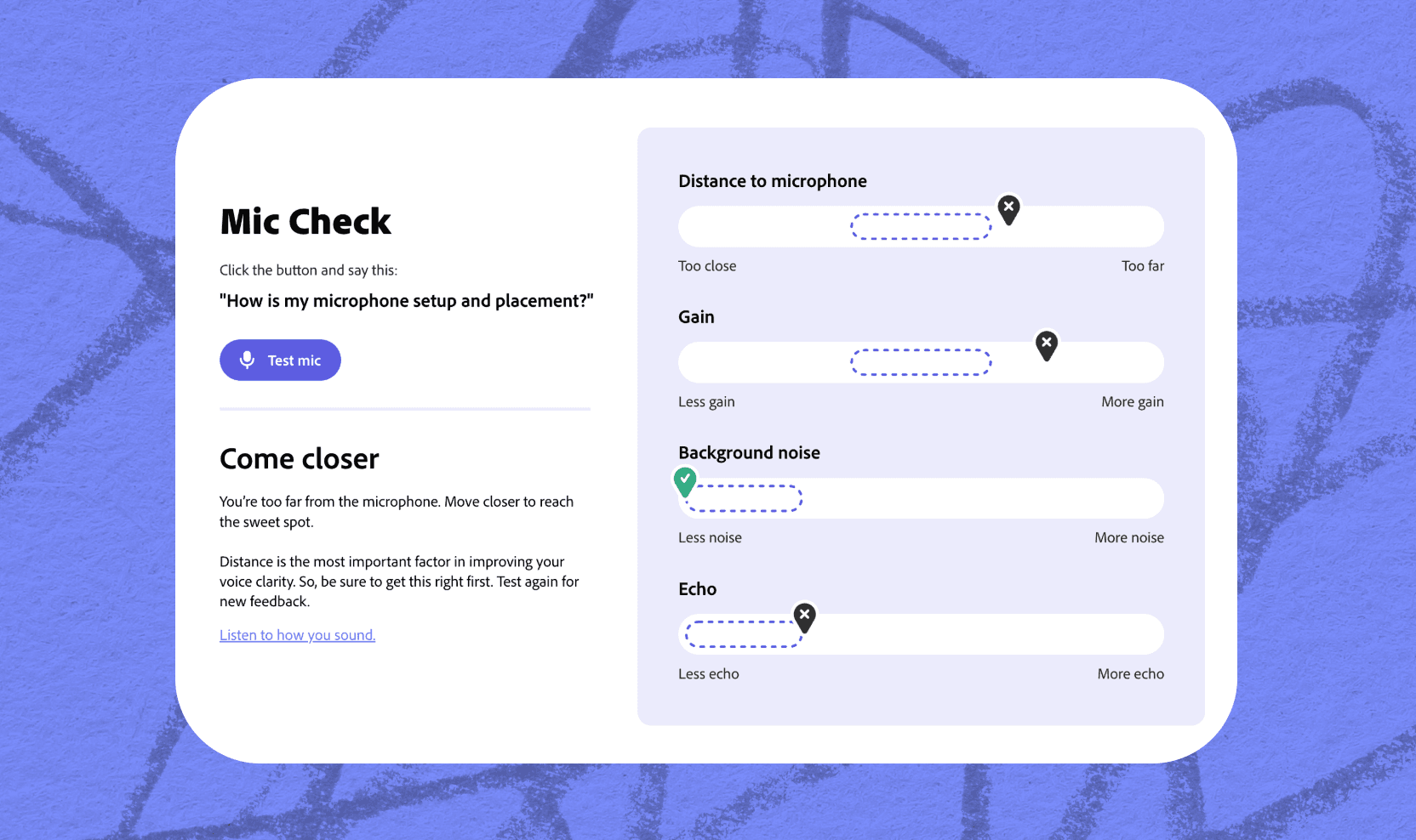Even when not using Studio from Adobe Podcast to record and edit with remote guests, you can use our Mic Check feature to quickly determine how clearly your device is recording audio and what adjustments (if any) need to be made.