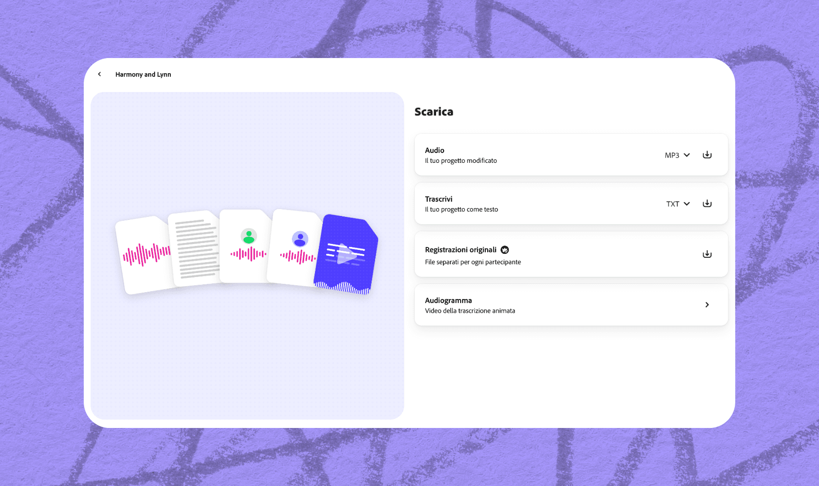 Dopo aver completato la registrazione e la modifica, puoi esportare il tuo progetto facendo clic sul pulsante “Scarica” nell’angolo in alto a destra della pagina. Scegli il formato di download e il tuo podcast sarà pronto per essere caricato sulla tua piattaforma preferita.