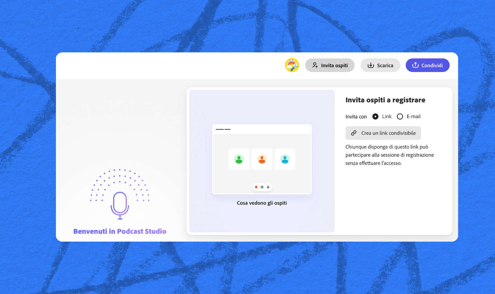 I podcaster affrontano molte sfide nella creazione dei contenuti, ma la gestione del tempo è spesso l’ostacolo più grande. Adobe Podcast Studio ti consente di registrare con più ospiti, eliminando la necessità di essere fisicamente nello stesso posto.