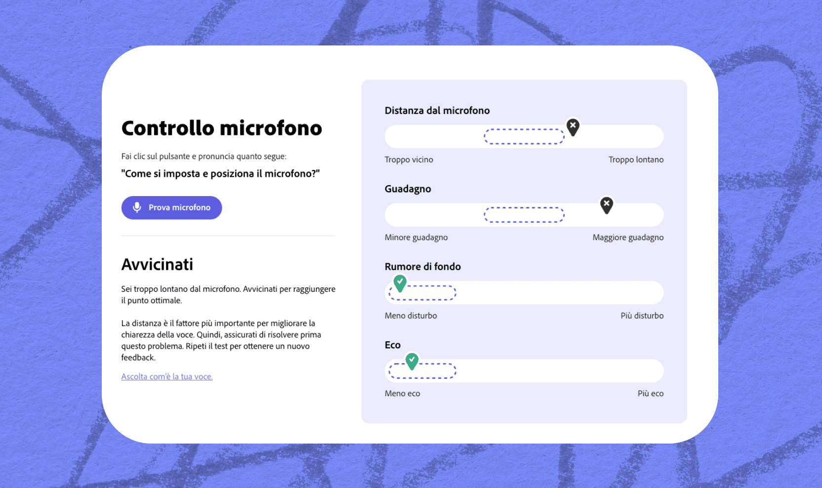 Dopo aver effettuato l’accesso, puoi utilizzare la funzione Mic Check per verificare il tuo microfono e l’ambiente di registrazione. Dopo pochi secondi di parlato, riceverai suggerimenti su come migliorare la qualità dell’audio.