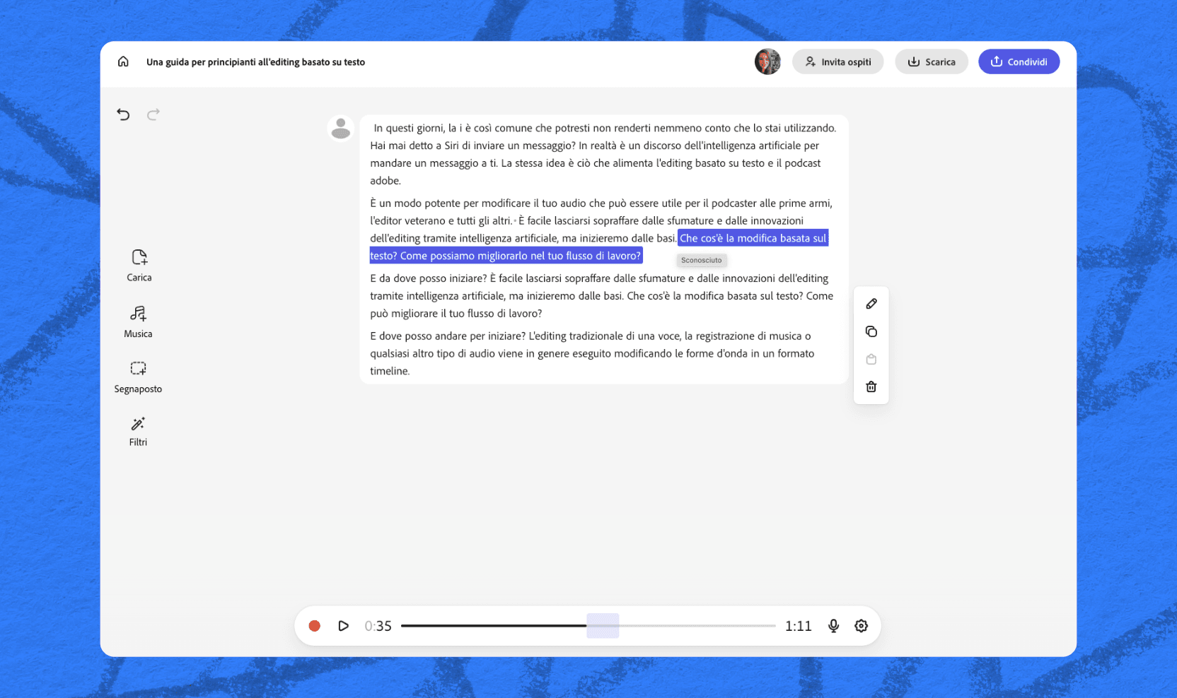 Scopri Adobe Podcast e prova i nostri strumenti per creare contenuti in modo più semplice ed economico. Approfitta delle nostre funzioni gratuite o iscriviti alla prova gratuita di 30 giorni per accedere alle funzionalità premium!